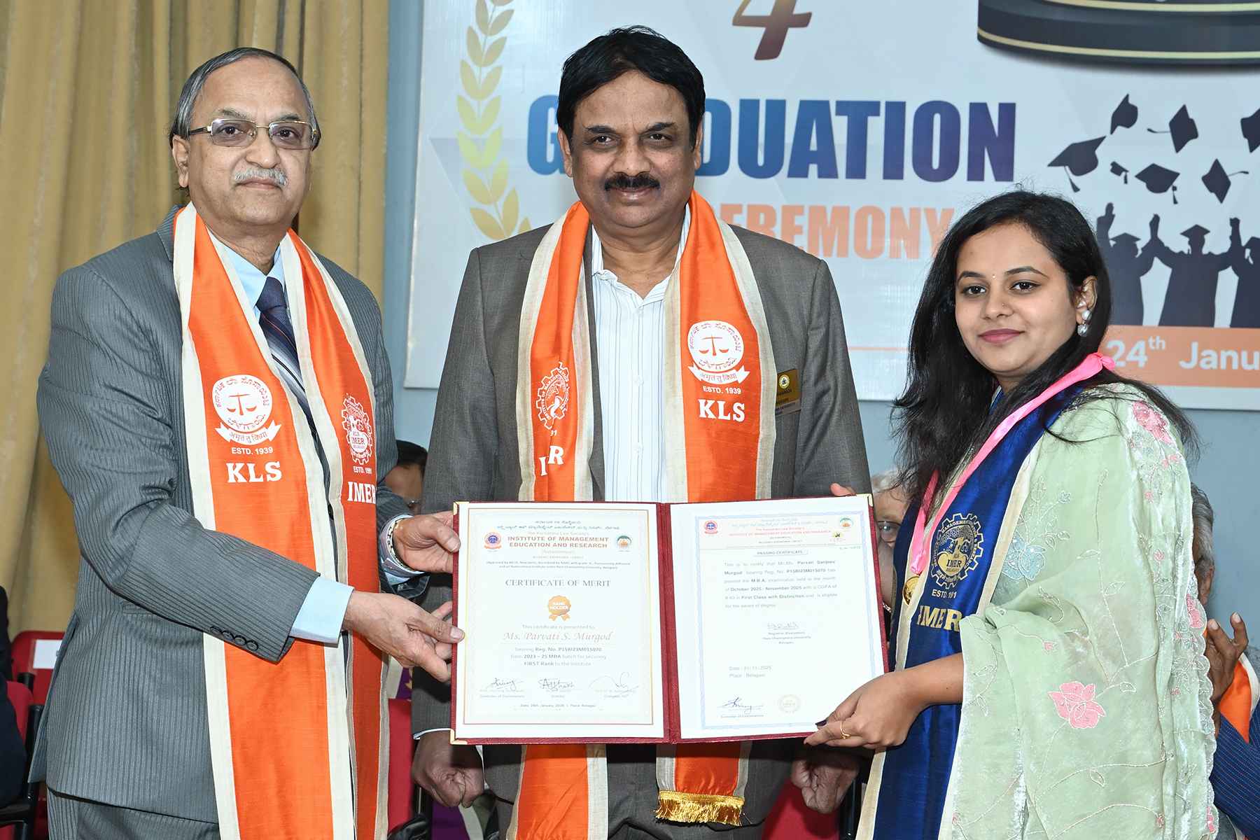 KLS IMER celebrated its Fourth Graduation Day on 24th January, 2026. 116 Students were awarded with the provisional passing certificate of MBA and top 10 students were felicitated on this occasion by the dignitaries. The assembly started with Academic procession. Shri.U N Kalkundrikar, Chairman, Governing Body, KLS IMER welcomed the gathering. Dr. Arif Shaikh, Director, presented the college report. On this occasion , Ms. Parvati Muragod secured the highest CGPA of 8.61 and stood 1st to the institute and begged Gold Medal and a cash prize of Rs. 10,000/-. Miss. Shravani Yarandole secured CGPA of 8.54 and bagged the silver medal with cash prize of Rs.7,000/-. Miss. Pragati Kolvekar scored the CGPA of 8.36 and bagged the Bronze Medal with cash proze of Rs. 5,000/-.