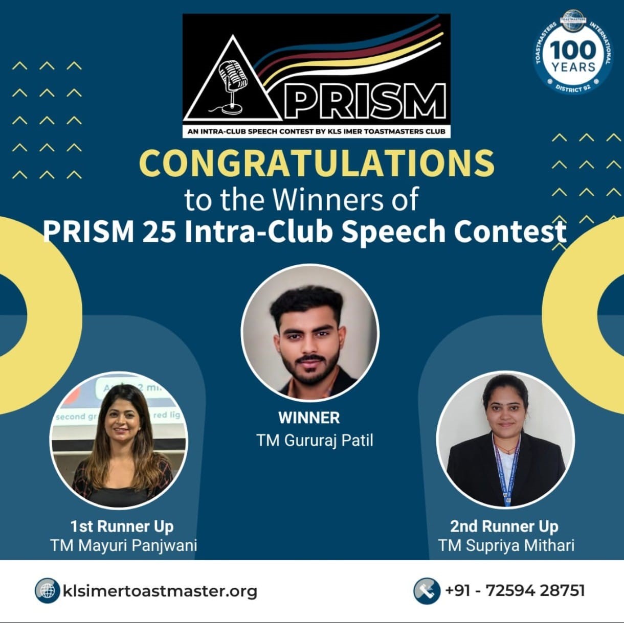 A big round of applause to the outstanding winners of the PRISM 25 Intra-Club Speech Contest organized by KLS IMER Toastmasters Club.