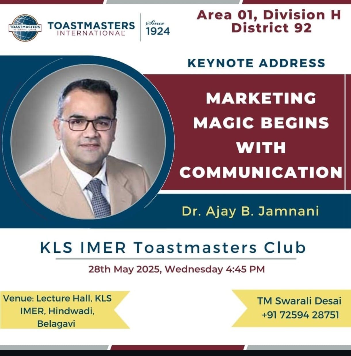 An inspiring keynote address by Dr. Ajay B. Jamnani on “Marketing Magic Begins with Communication”, organized by KLS IMER Toastmasters Club under Toastmasters International.
